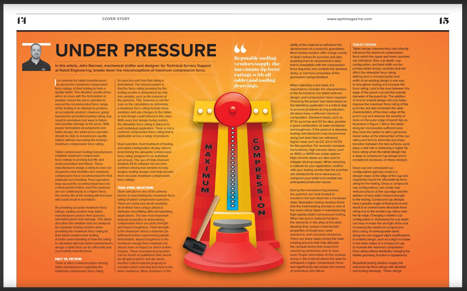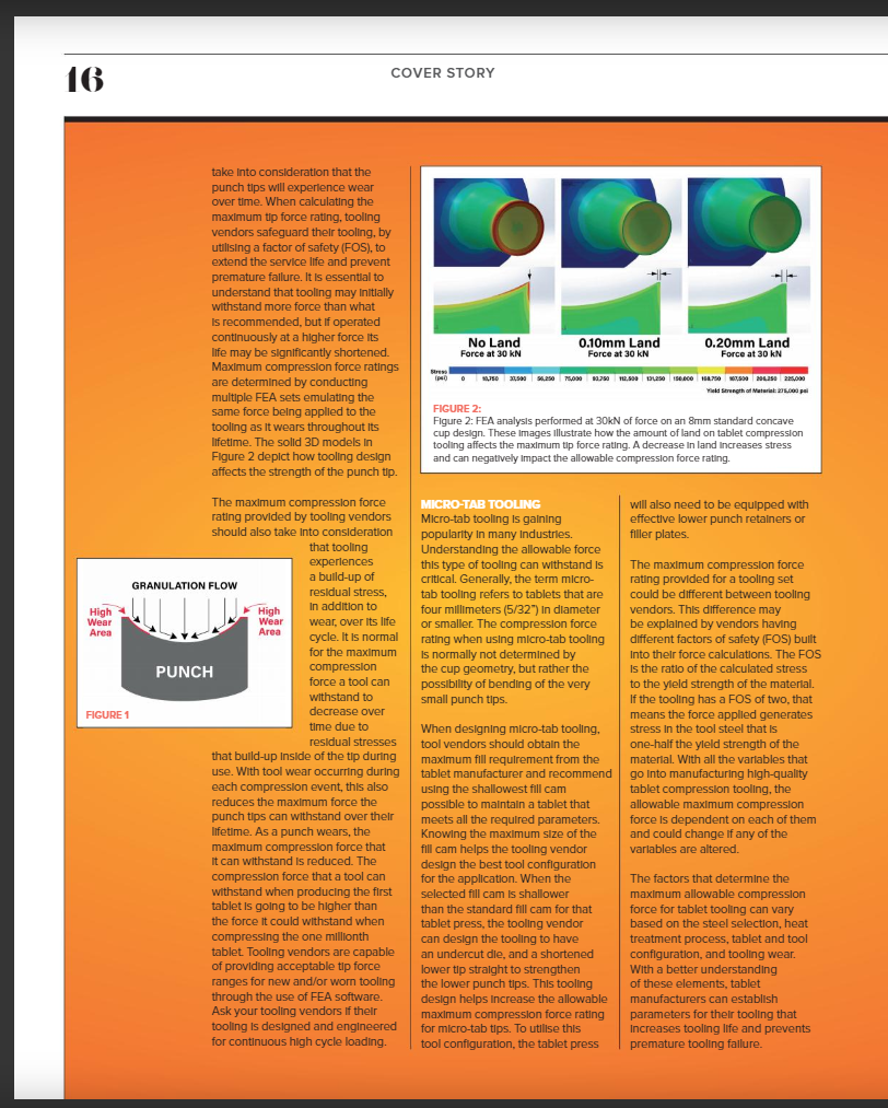 It is common for tablet manufacturers to exceed the maximum compression force ratings of their tooling to form a quality tablet. This situation usually arises when an issue with the formulation or powder causes the press operator to exceed the recommended force range of the tooling in an attempt to produce an acceptable product. However, going beyond the prescribed tooling rating may result in premature tool wear or failure and possible damage to the press. With proper formulation development and tablet design, the tablet press operator should be able to manufacture quality tablets without exceeding the tooling’s maximum compression force rating.